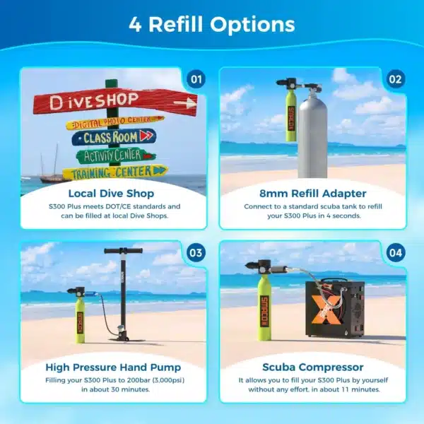 You can refill it using a SMACO high-pressure air compressor, a manual pump, or at a dive shop with a standard scuba tank adapter.