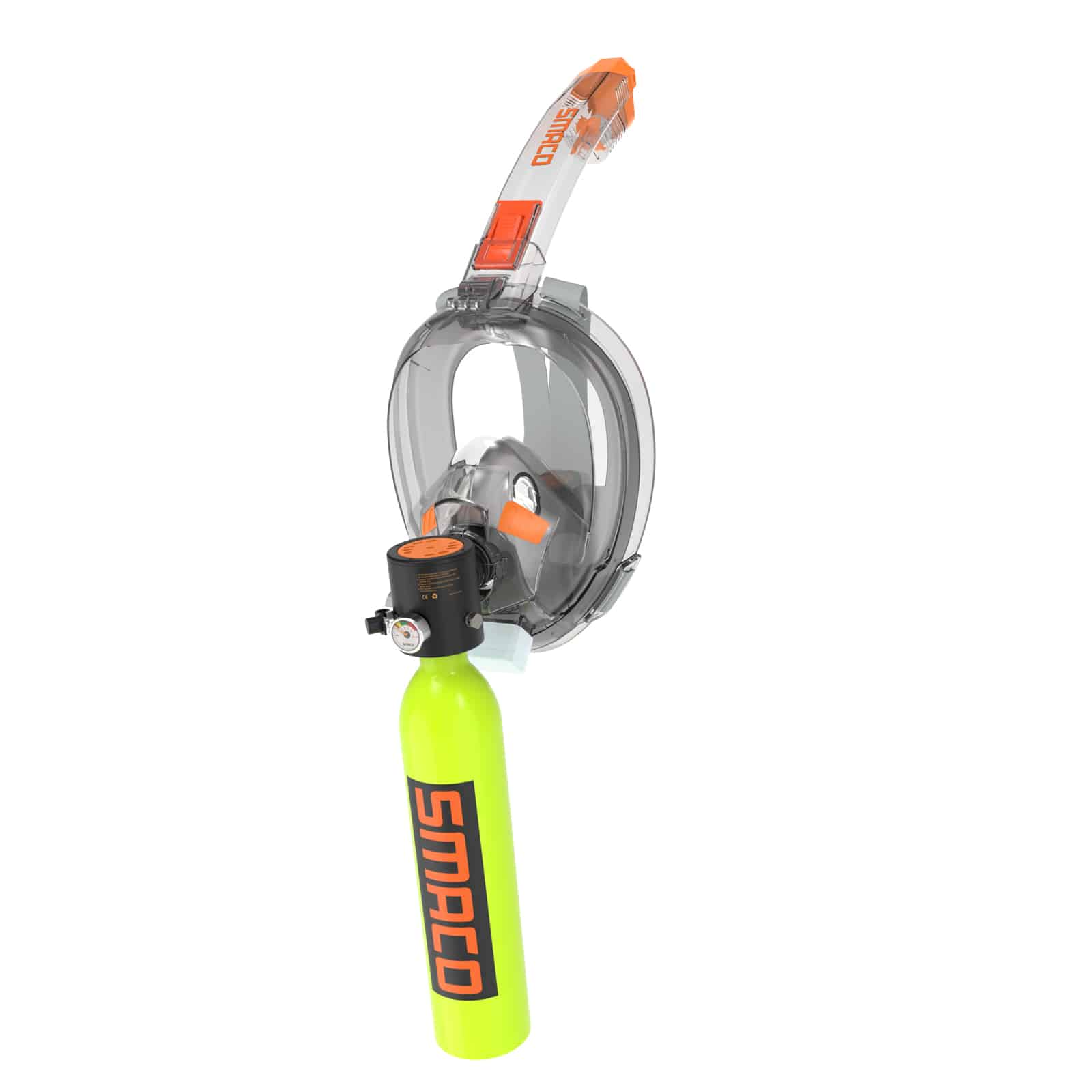 Basic package includes: SMACO M8038 full face snorkel mask, mini scuba tank, regulator, and an upgraded connector.