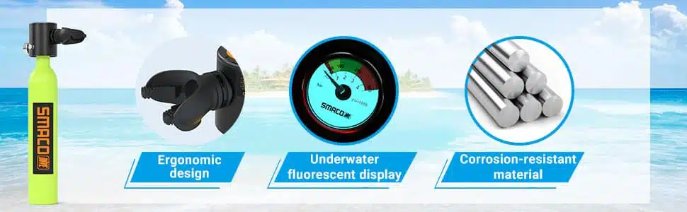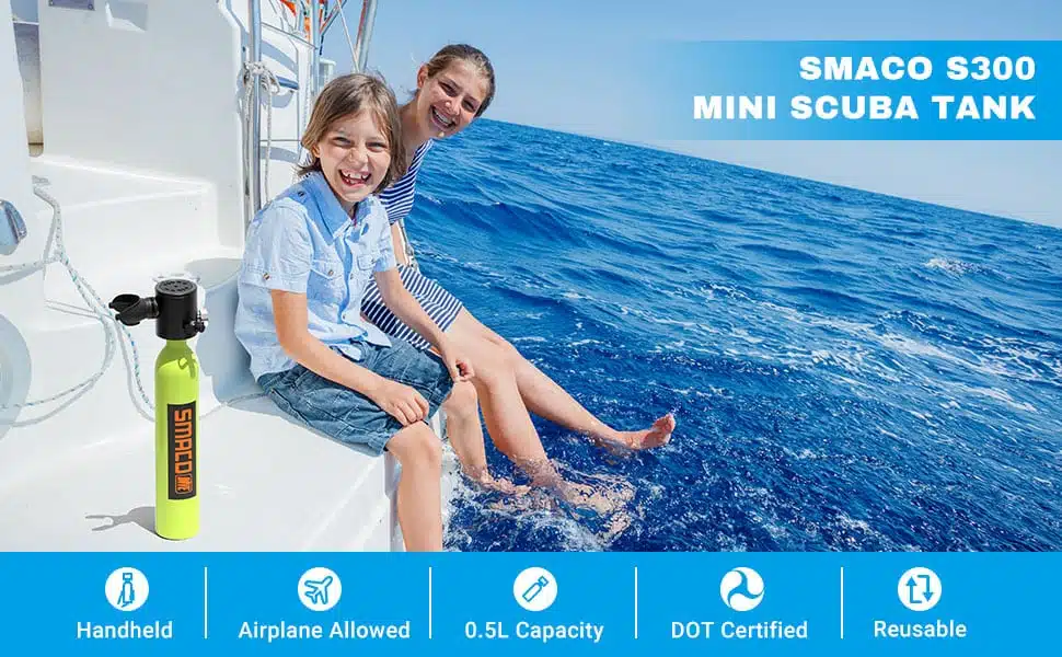 SMACO S300 is a compact, portable and refillable diving solution with up to 10 minutes of dive time. Ideal for underwater exploration, snorkeling, diving, emergency rescue, and more. Features include a safety-enhanced explosion-proof device, upgraded breathing valve, and 4 easy inflation methods. Lightweight, airplane-approved, and perfect for your travel.