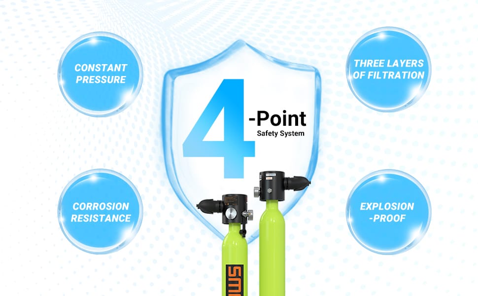 This 0.5liter mini diving tank allows you to breathe underwater for up to 10 minutes. At the same time, the scuba tank has three-layer filtration device, which effectively prevents the entry of dust and impurities, making the inhaled gas cleaner. (Attention: Diving depth, temperature, and breathing rate will affect the use time of the scuba tank.)