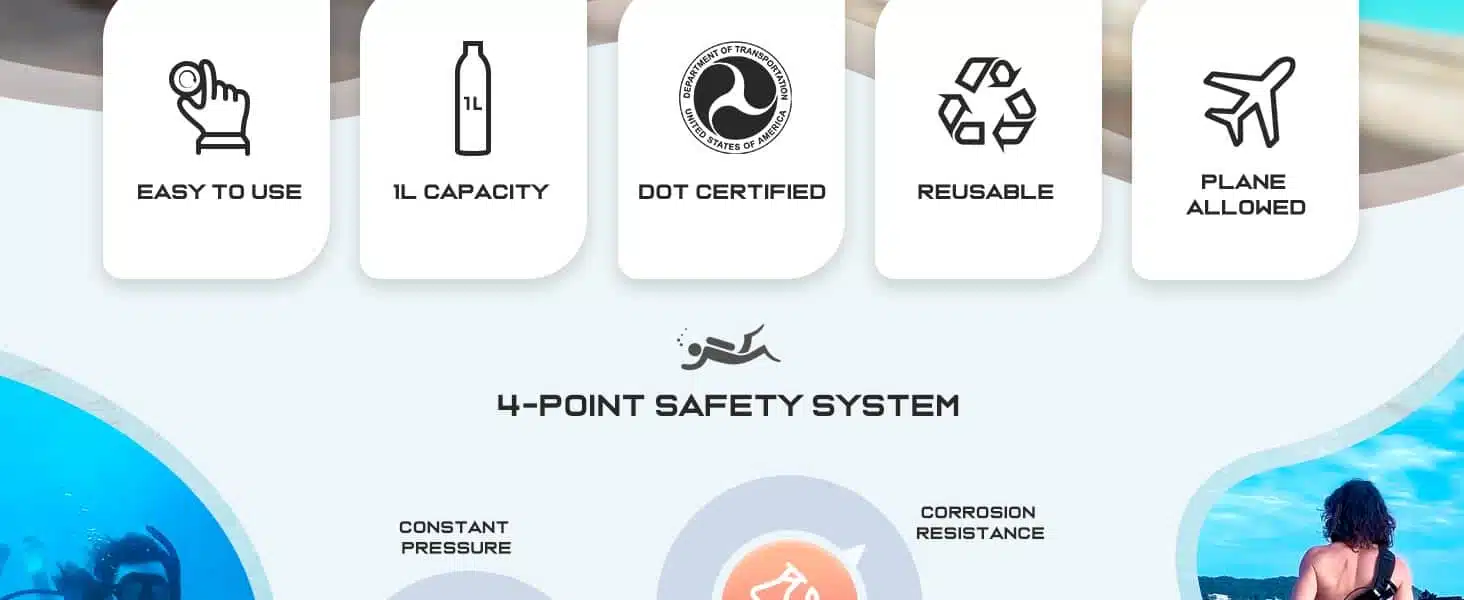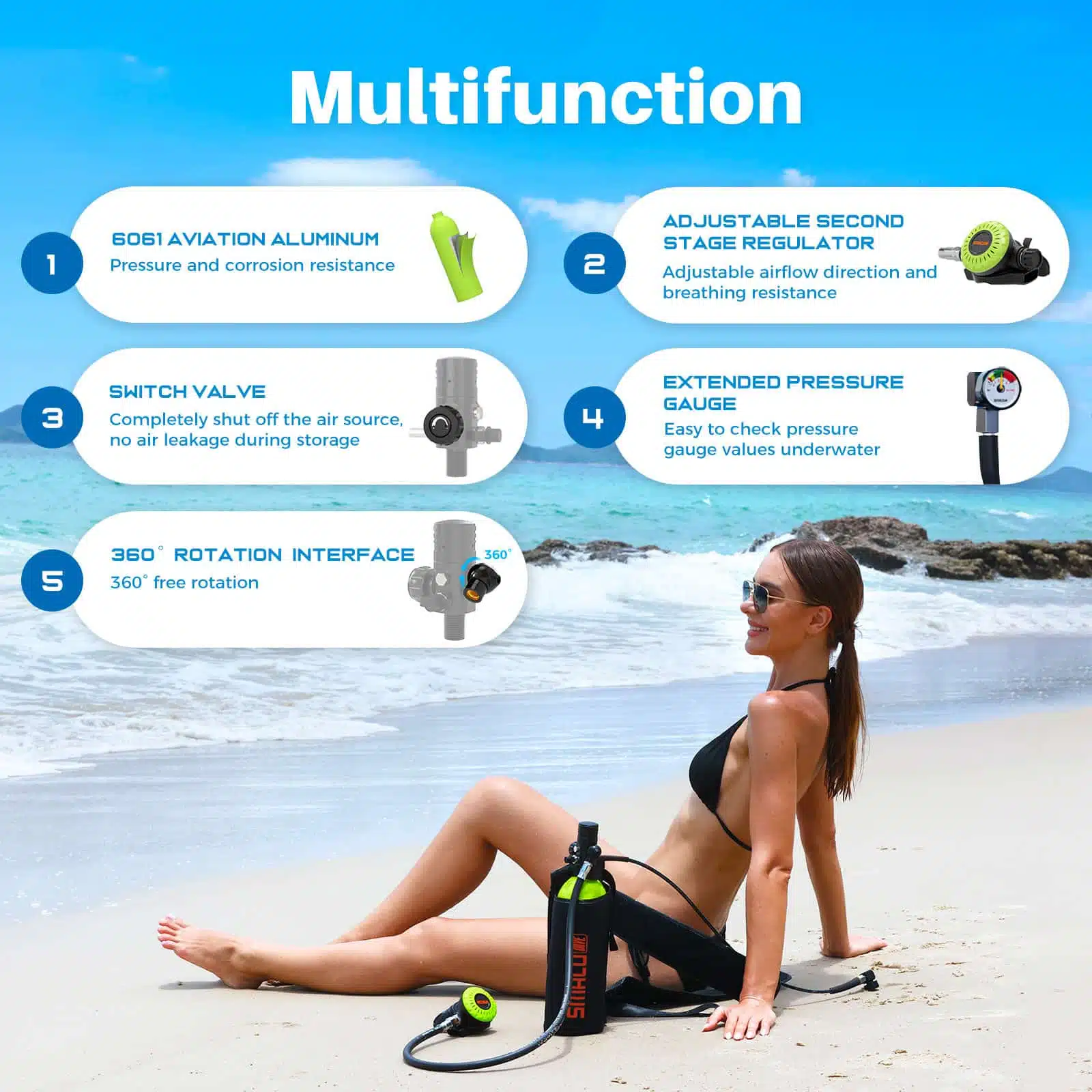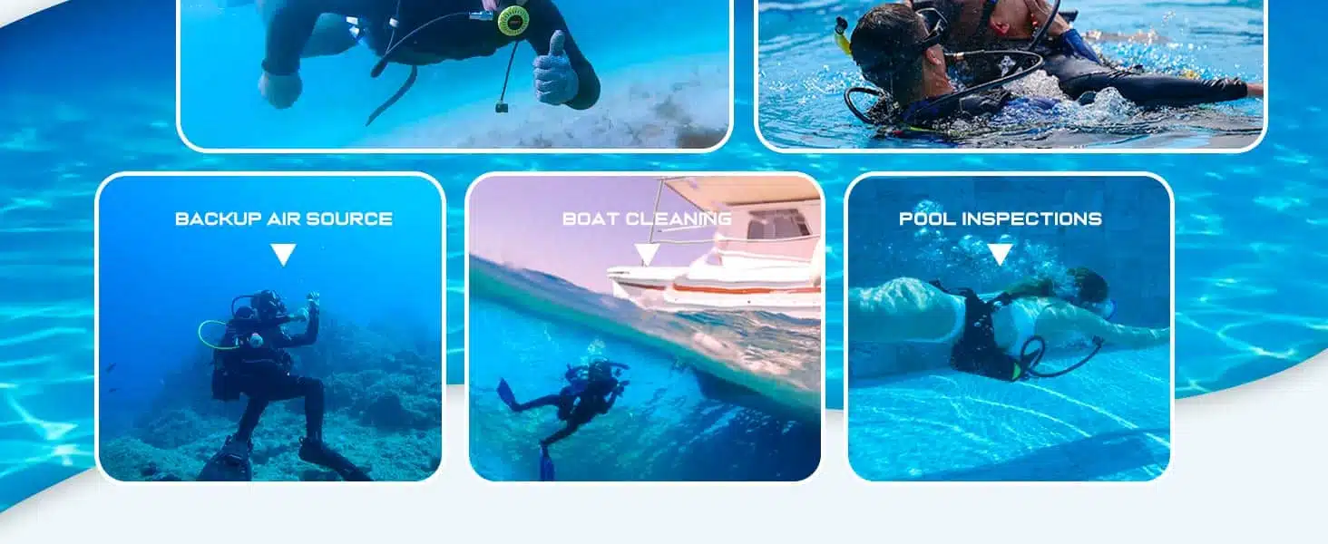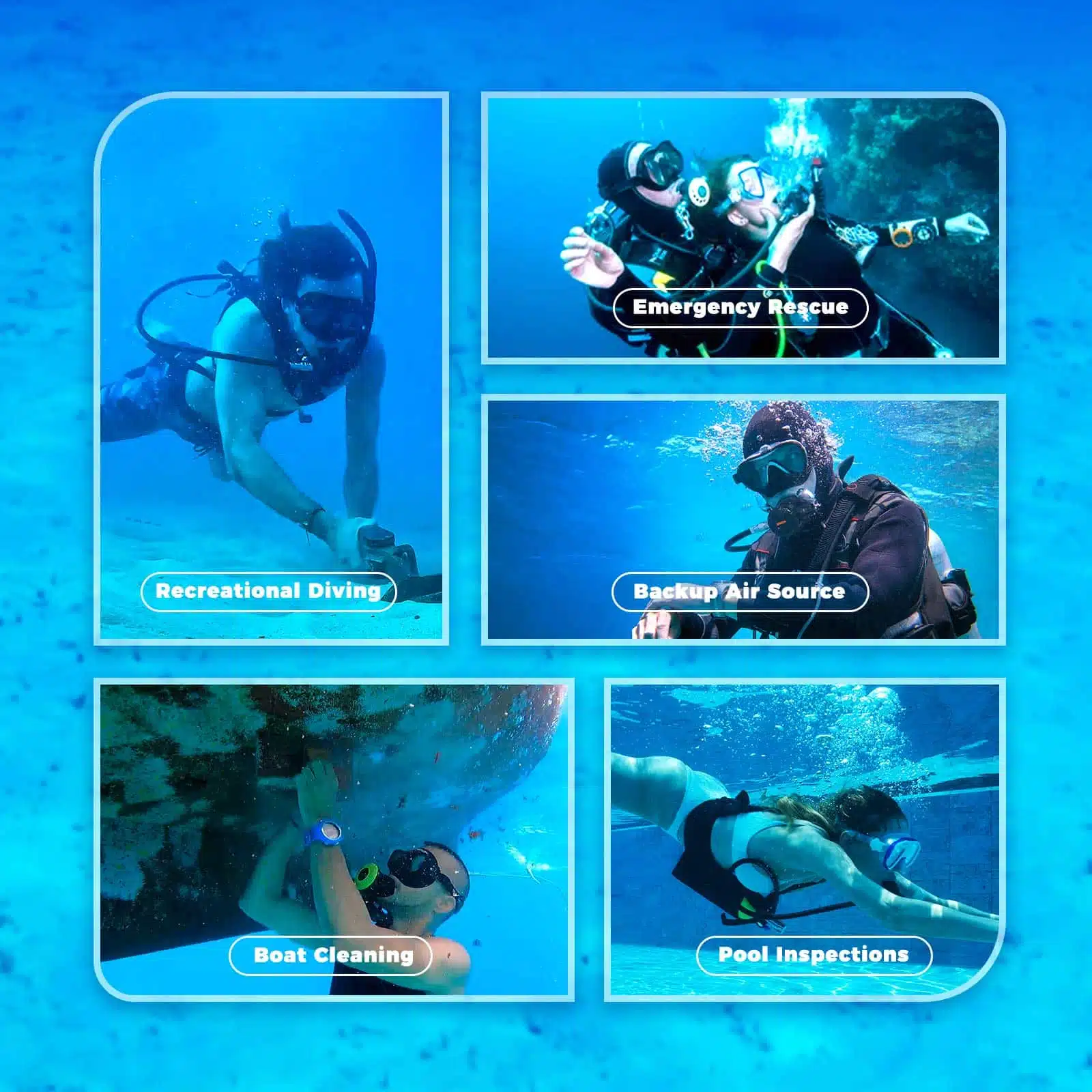It has a safe depth limit of about 33 ft (It can be used as a backup air source for deep diving within 100 ft). Mini diving cylinder is suitable for underwater exploration, boat cleaning, emergency rescue, backup air source, etc