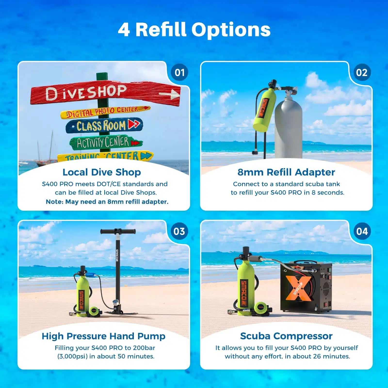 S400pro is a mini scuba tank that you can fill by yourself, and allows you to breathe up to 20 minutes! It is suitable for every professional diver or beginner. Even new divers need their reliability. Diving for a few minutes becomes a different experience.
