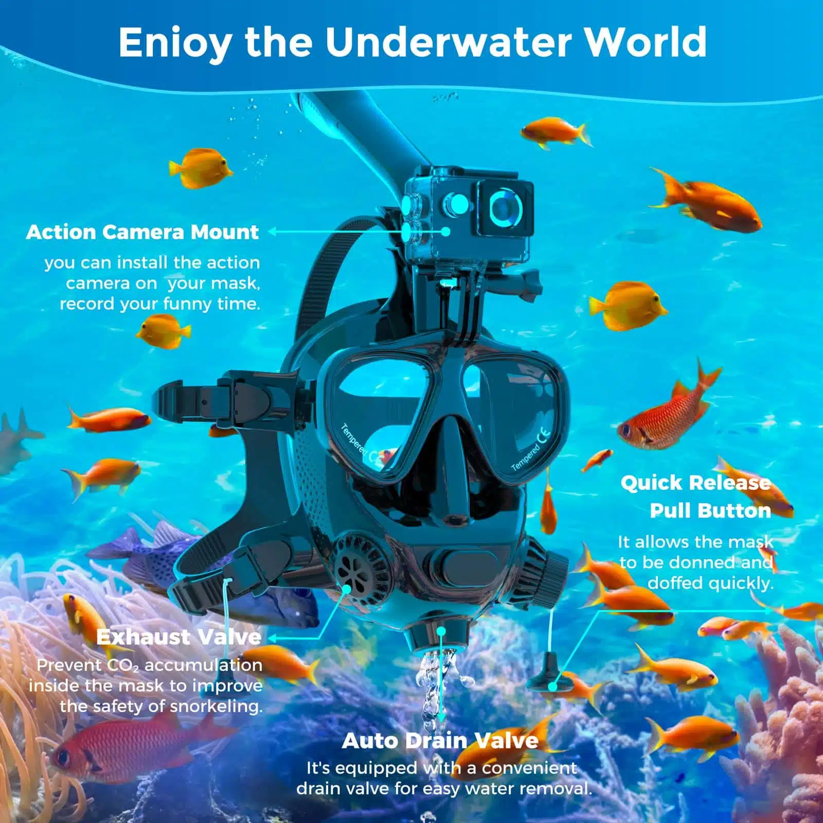 The snorkeling mask is equipped with a convenient drain valve for easy water removal.