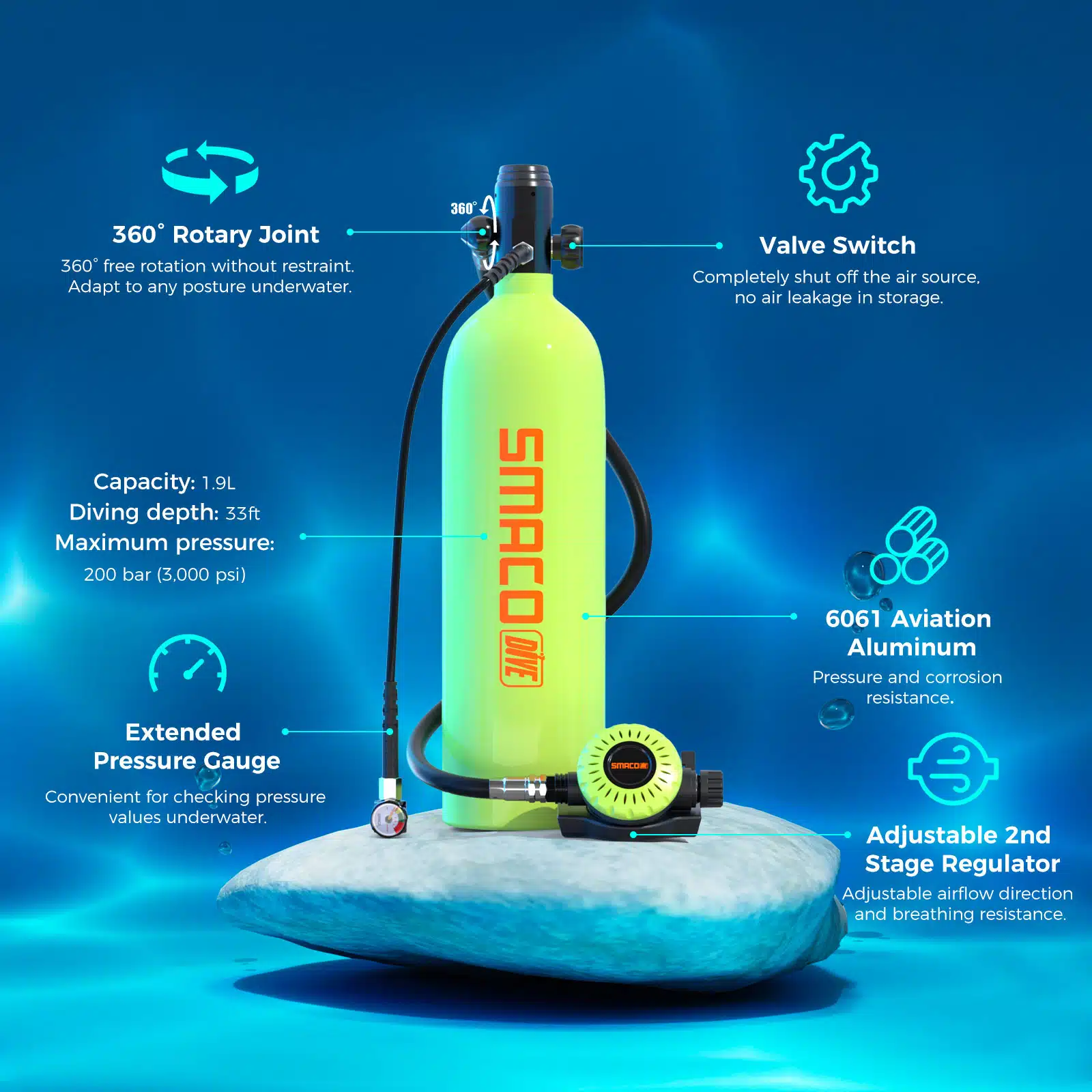 Enjoy up to 25 minutes of underwater freedom with the 1.9L high-pressure tank. (Actual time may vary based on depth, breathing rate, and temperature.)
