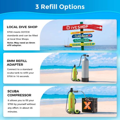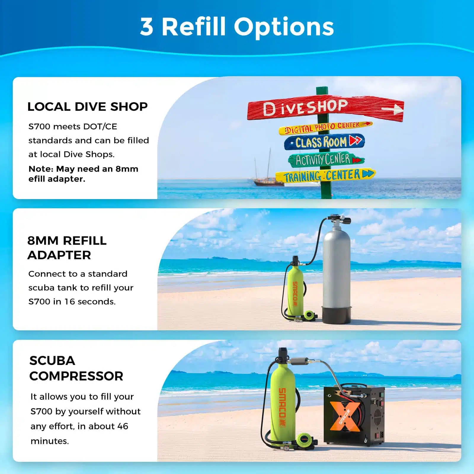 - Fill at your local dive shop (CE/DOT-certified tank)