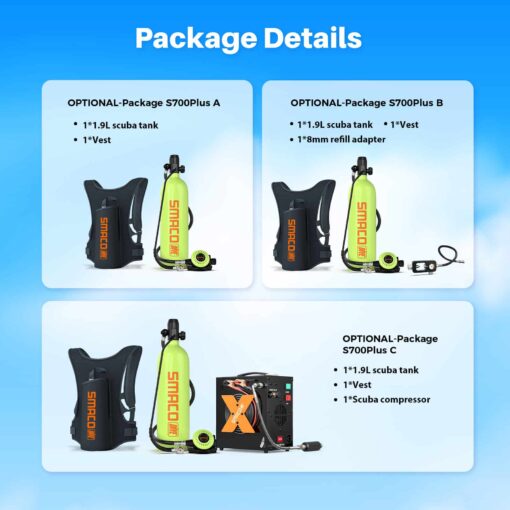 S700 mini scuba tank (the regulator is separated from the body, you'll need to assemble them), portable backpack, user's manual, and some additional interchangeable accessories.